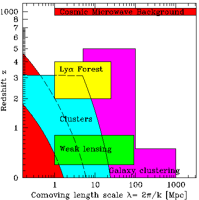 Shaded regions show ranges of scale and redshift over which