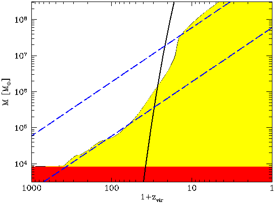5000 solar masses at z=100 as molecular cooling becomes effective.